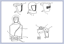 1 Element oczyszczający 2. Dmuchawa 3. Przyłbica spawalnicza 4. Osłona twarzy 5. Kaptur 6. Hełm 7. Wąż oddechowy 8. Pas biodrowy lub nośny