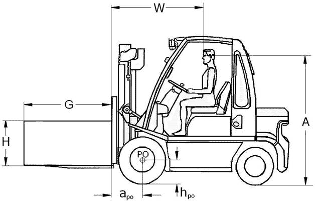 odległość apo położenia osi obrotu PO płaszczyzny oporowej ładunku od tej płaszczyznynależy wziąć z danych producenta podnośnikowego wózka jezdniowego czołowego lub zmierzyć za pomocą uniwersalnych przyrządów pomiarowych (np. wysokościomierza, suwmiarki) z niepewności a wynoszącą ± 0,001 m;