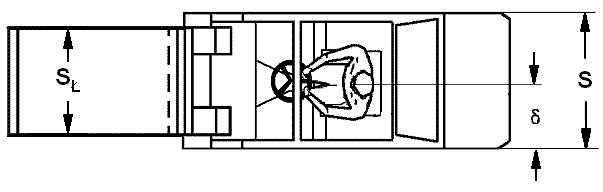 Do narysowania wyżej omówionego uproszczonego modelu wózka w rzucie z góry niezbędne są dane dotyczące szerokości wózka i ładunku oraz położenia pionowej płaszczyzny symetrii fotela operatora względem krawędzi wózka – jak to uwidoczniono przykładowo na rysunku 4. Dane te można otrzymać albo z danych technicznych producenta wózka, albo z pomiarów. Można przyjąć, że punkt środkowy między oczami operatora wózka w stanie gotowości do jazdy znajduje się w płaszczyźnie symetrii fotela.