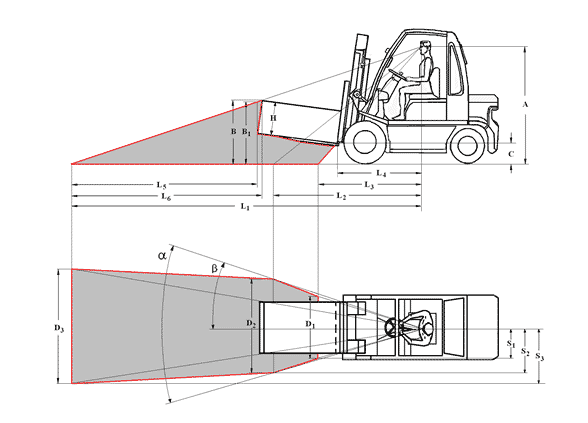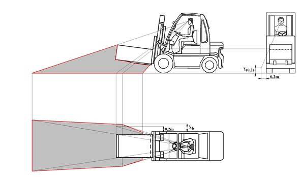 Metoda dokładna określania widoczności otoczenia przez operatora podnośnikowego wózka jezdniowego czołowego, wynikającej z wymiarów przewożonego ładunku, z uwzględnieniem wymiarów strefy braku widoczności (strefy martwej)