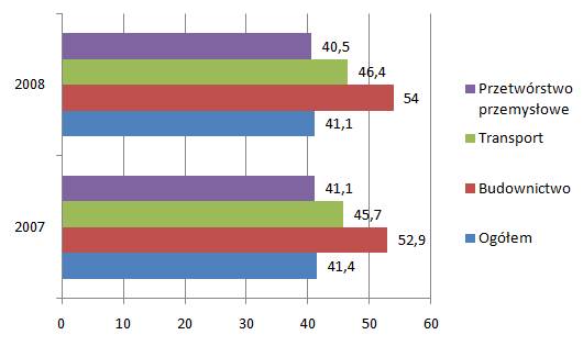 Rys. 4. Średnia absencja na 1 poszkodowanego w wypadkach przy pracy w budownictwie, transporcie i przetwórstwie przemysłowym, w latach 2007 – 2008.