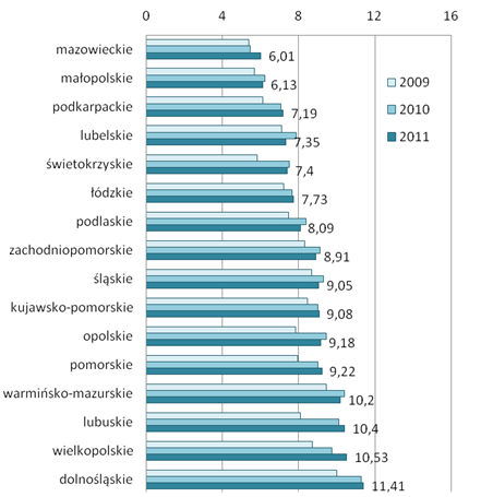Najrzadziej, w latach 2009 - 2011 do wypadków przy pracy dochodziło w województwie mazowieckim oraz małopolskim, dla których wartość wskaźnika wypadkowości nie przekroczyła 7 na 1000 pracujących.
