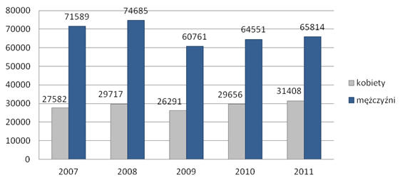 Rys. 11. Liczba wypadków przy pracy wśród kobiet i mężczyzn w Polsce w latach 2007 - 2011