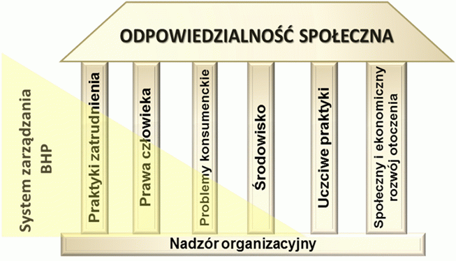 Wprowadzanie zasad odpowiedzialności społecznej w ramach systemu zarządzania bezpieczeństwem i higieną pracy można realizować, podobnie jak w innych obszarach odpowiedzialności społecznej, zgodnie z zasadami przedstawionymi w normie ISO 26 000 (rys.2). Z analizy wytycznych tej normy wynika, że system zarządzania bezpieczeństwem i higieną pracy może służyć jako narzędzie wdrażania zasad odpowiedzialności społecznej przede wszystkim w obszarze nazwanym „Praktyki zatrudnienia”, w którym duża część działań i oczekiwań ma bezpośrednie odniesienie do tego systemu. Również w obszarach takich jak „Prawa człowieka”, „Problemy konsumenckie” oraz „Środowisko” można zidentyfikować działania i oczekiwania, które mają bezpośredni związek z zarządzaniem bezpieczeństwem i higieną pracy. W sposób oczywisty z wdrożeniem i doskonaleniem systemu łączy się umacnianie nadzoru organizacyjnego, który w kontekście odpowiedzialności społecznej pełni rolę zarówno podstawowego obszaru działań, jak i metody zwiększania zdolności organizacji do wdrażania społecznie odpowiedzialnych praktyk w każdym z pozostałych obszarów.
