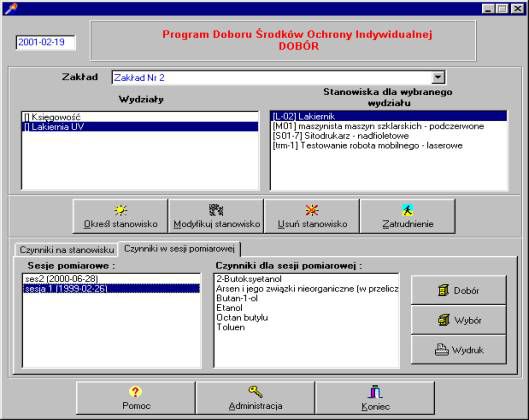 Po wprowadzeniu lub automatycznym pobraniu z bazy systemu STER niezbędnych danych dotyczących struktury przedsiębiorstwa (zakładów, wydziałów, stanowisk, czynników na stanowisku), można rozpocząć dokonywanie doboru środków ochrony indywidualnej. Jeśli pracowano z modułem RYZYKO, dobór możliwy jest dla każdej sesji pomiarowej oddzielnie. Rozpoczęcie procesu doboru środków ochrony indywidualnej jest inicjowane uaktywnieniem przycisku Dobór, dostępnego bezpośrednio z winiety modułu.