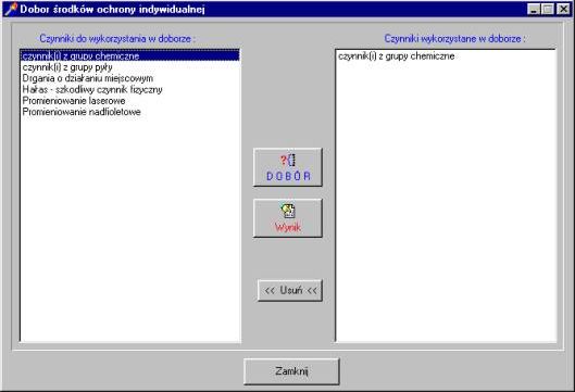 Na rysunku poniżej przedstawiono podstawowy formularz procedury doboru środków ochrony indywidualnej dla wybranego stanowiska pracy lub wybranej sesji pomiarowej. Po wybraniu z listy czynników szkodliwych jednego z czynników i naciśnięciu przycisku Dobór uruchamiana jest procedura doboru przypisana do tego czynnika lub grupy czynników.