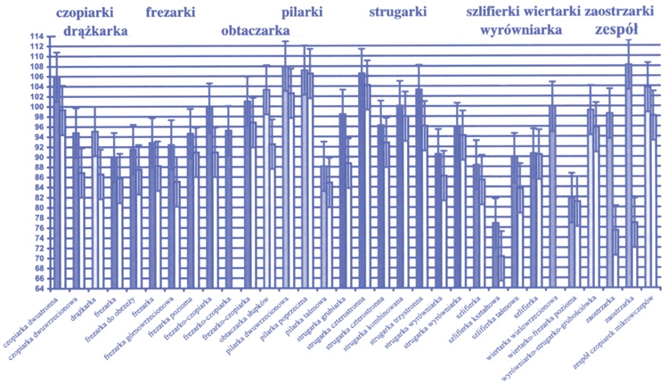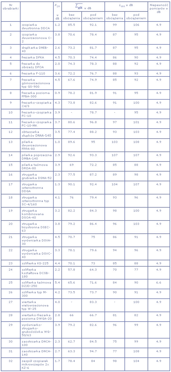 zmierzony dla badanych obrabiarek wahał się w granicach: 64-97 dB (maszyny pod obciążeniem) oraz 58-93 dB (maszyny podczas biegu jałowego). Odpowiednio poziom mocy wyniósł: 77-108 dB (pod obciążeniem) oraz 71-107 dB (bez obciążenia). Niepewność pomiarów określona dla poprawki środowiskowej